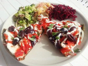 Down the path and tucked amid the trees is the café entrance. Drinks are $4-$8 for cold mochas with nut milk, fresh pressed juices and super smoothies. Meals are $12-$14 with the menu offering a variety of raw, vegan, organic foods including wraps, falafel, quiche and pizza – all served with salads. Make sure you save room for a cheeky dessert and may I recommend the berry cheesecake. Berryliscious!